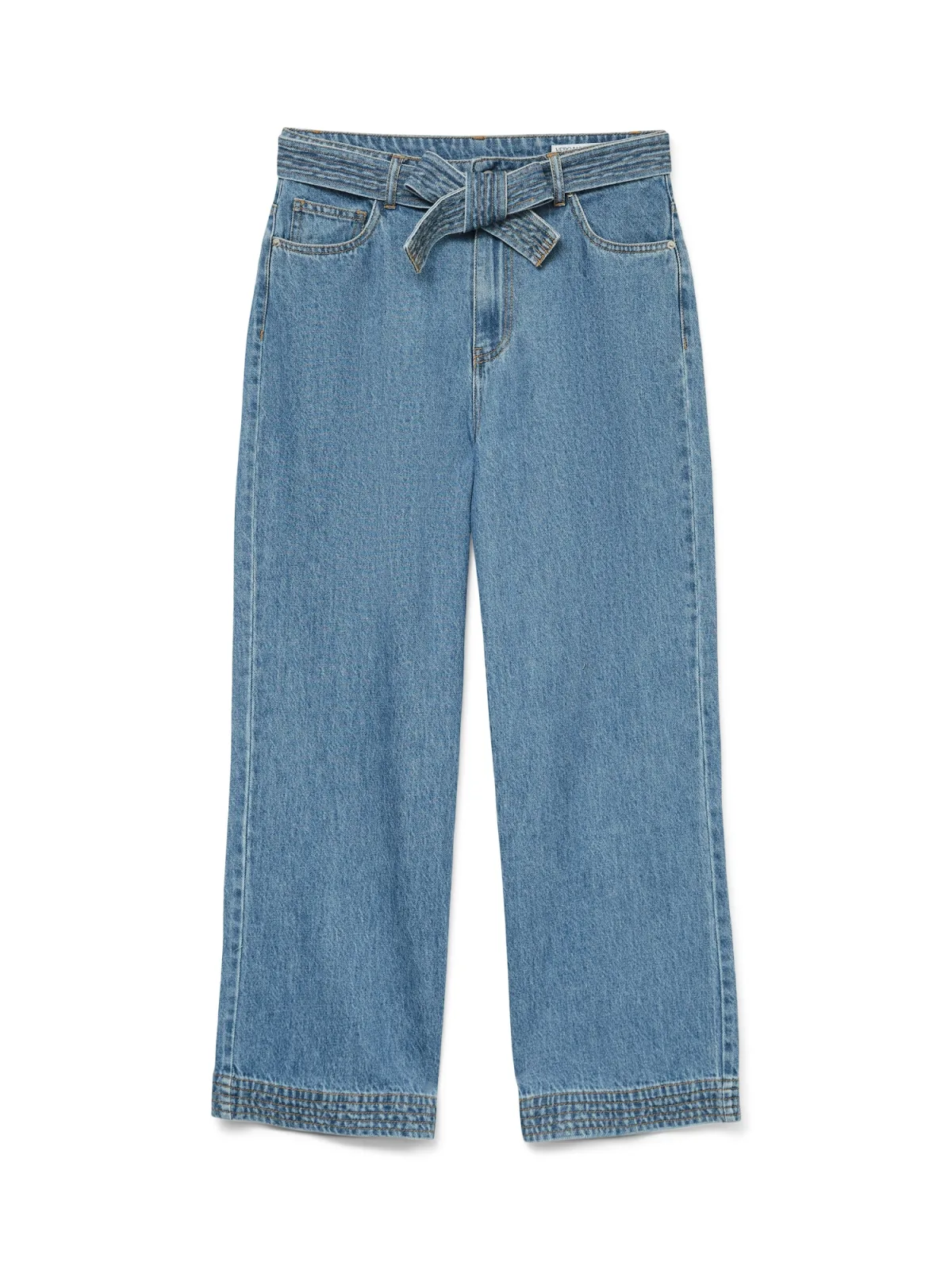 Design: Met band/snoer, 5-pocket-style; Type sluiting: Ritssluiting; Materiaal: Denim; Motief: Effen; Extra's: Studs, Contrasterende naden; Wassing: Blauw denim; Lengte: 7/8 lengte; Pasvorm: Wide leg; Taillehoogte: Mid waist