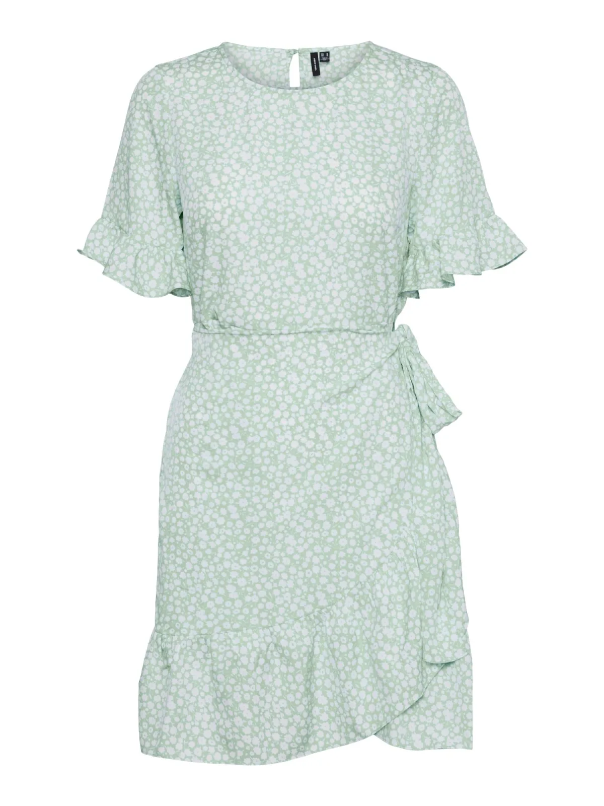 Design: Gevoerde zoom/rand, Keyholesluiting, Om te knopen/binden; Type sluiting: Knoopsluiting; Materiaal: Gerecycled materiaal; Halstype: Ronde hals; Motief: Bloemenprint; Soort bandjes: Normale bandjes; Details: Cut-outs, Volant, Wikkel design; Extra’s: All-over patroon; Lengte: Kort/mini; Pasvorm: Normale pasvorm; Armlengte: Halve mouw