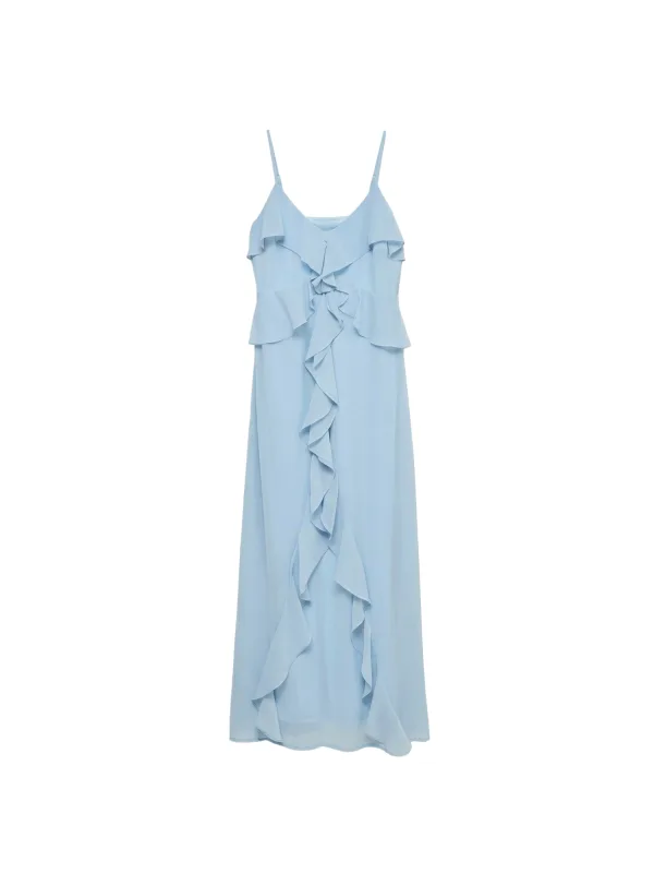 Design: Rechte zoom, Diepe snit/decolleté; Halstype: V-hals; Motief: Effen; Soort bandjes: Spaghettibandjes; Details: Volant; Extra's: Verstelbare bandjes, Op staal naden, Lichte stof; Lengte: 7/8 lengte; Snit: Getailleerd; Pasvorm: Normale pasvorm; Armlengte: Mouwloos
