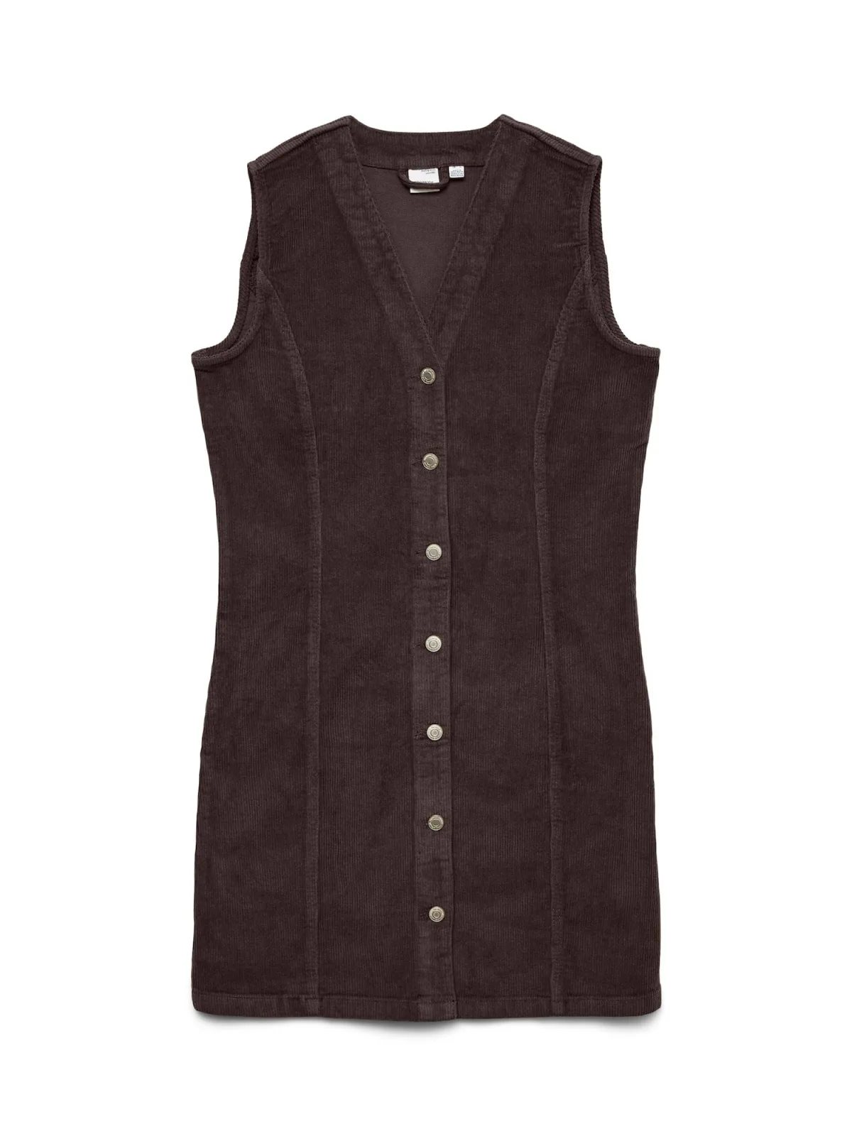 Design: Knop sluiting; Materiaal: Corduroy; Halstype: V-hals; Motief: Effen; Soort bandjes: Brede bandjes; Extra’s: Op staal naden; Lengte: Kort/mini; Pasvorm: Normale pasvorm; Armlengte: Mouwloos