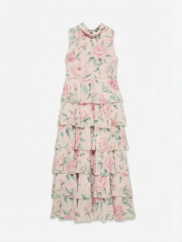 dames vrijetijdsjurk van Vero Moda;Model 'Felicia';look: meerkleurig;pasvorm: getailleerd;Lengte: midi;hals: hooggesloten;Patroon: bloemenmotief;Applicatie: volants;materiaalverwerking: chiffon