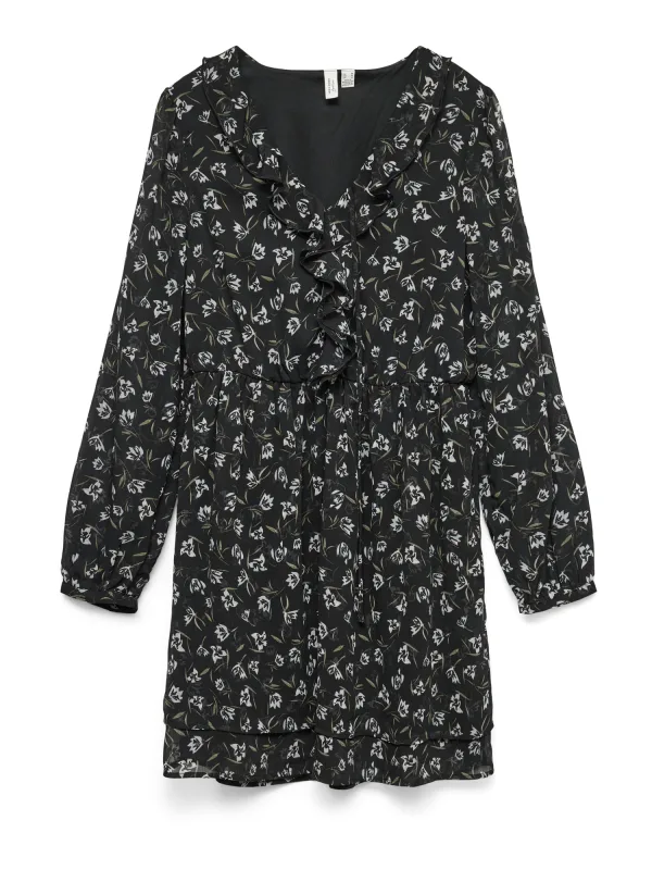 Design: Gevoerde zoom/rand, Rechte zoom; Materiaal: Gerecycled materiaal; Halstype: V-hals; Details: Volant, Gedrapeerd; Extra's: All-over patroon, Lichte stof; Lengte: Kort/mini; Snit: Getailleerd; Pasvorm: Normale pasvorm; Armlengte: Lange mouw