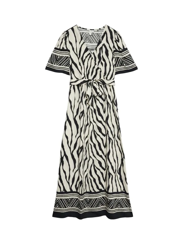 Design: Gevoerde zoom/rand, Pofmouwen, Tailleriem; Materiaal: Viscose; Halstype: V-hals; Motief: Dierenprint; Details: Gedrapeerd, Wikkel design; Extra's: All-over patroon, Gladde stof; Lengte: Lang/maxi; Snit: Getailleerd; Pasvorm: Normale pasvorm; Armlengte: Halve mouw