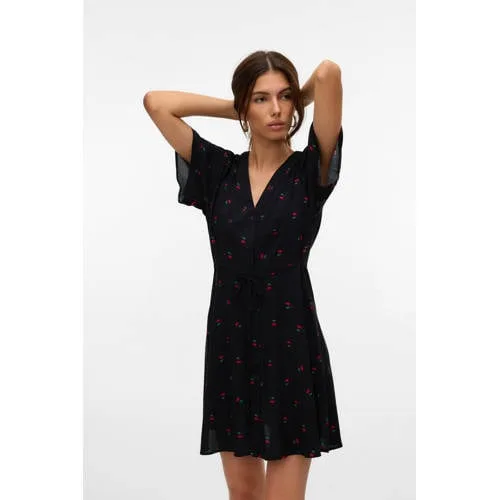 Deze jurk van VERO MODA heeft korte mouwen en een V-hals met knoopsluiting. De jurk is gemaakt van viscose, heeft wijde mouwen en knoopdetails. Ideaal voor warme dagen of een feestelijke gelegenheid.