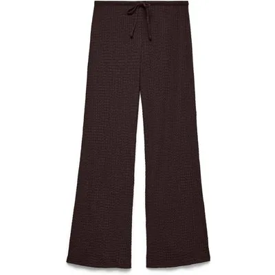 Specificaties: * Pasvorm: regular fit; hoge taille en wijde broekspijpen * Sluiting: aantrekkoord in de tailleband * Kleur: donkerbruin * Materiaal: 95% polyester – 5% elastaan