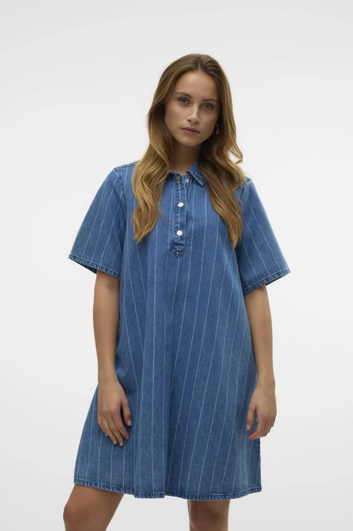 Deze VERO MODA spijkerjurk is een stijlvolle toevoeging aan jouw garderobe. Gemaakt van katoen in een medium blauwe denim kleur. Met een klassieke kraag, korte mouwen en een knoopsluiting. De jurk heeft een middelmatige lengte.