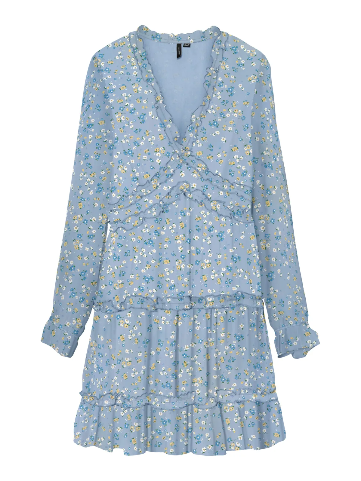 Design: Gevoerde zoom/rand, Diepe snit/decolleté; Materiaal: Gerecycled materiaal; Halstype: V-hals; Motief: Bloemenprint; Details: Ruches, Volant; Extra's: All-over patroon, Gladde stof, Milieuvriendelijk geproduceerd; Lengte: Kort/mini; Snit: Uitlopend; Pasvorm: Normale pasvorm; Armlengte: Lange mouw