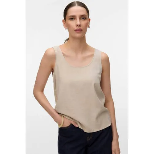 Voor een lichte, verzorgde look in je dagelijkse garderobe is deze VERO MODA mouwloze top voor dames een fijne basis. De effen beige kleur laat zich makkelijk combineren en het geweven materiaal geeft een rustige, nette uitstraling. Dankzij de ronde hals en mouwloze snit oogt de top modern en vrouwelijk, ideaal voor werk, etentjes of een casual dag in de stad.Details die het verschil maken Effen beige kleur die eenvoudig te combineren is met jeans, pantalon of rok Mouwloos model met rechte mouwinzet voor een rustige, strakke lijn langs de schouders Ronde hals die mooi aansluit en geschikt is voor zowel solo als onder een blazer of vest Geweven materiaal van 55% viscose en 45% linnen voor een luchtig en soepel gevoel Handwas aanbevolen, niet geschikt voor droger en niet strijken volgens wasvoorschrift Valt normaal volgens maatadvies, dus je kunt je gebruikelijke maat kiezenTe dragen van lente tot en met herfstIn de lente draag je deze top los op een lichte broek of rok, in de herfst combineer je hem makkelijk onder een vest of jasje. De neutrale kleur maakt het eenvoudig om te spelen met accessoires, bijvoorbeeld een subtiele ketting of sjaal.VERO MODA als vertrouwde basisVERO MODA staat bekend om toegankelijke mode die goed aansluit bij het dagelijks leven. De collecties bieden actuele stijlen die gemakkelijk te combineren zijn, zodat je met een paar doordachte items veel verschillende outfits samenstelt.Een veelzijdige top die je garderobe rustig, stijlvol en praktisch aanvult.