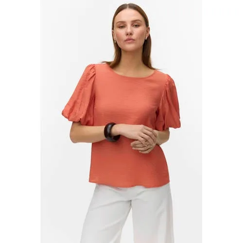 Breng kleur in je dagelijkse outfits met deze VERO MODA koraalrode dames top. De effen top in stijlnaam VMNELLIE heeft een koraalrode tint die direct in het oog valt. De ronde hals en korte pofmouwen geven een vrouwelijke uitstraling, terwijl de geweven stof soepel en licht langs je lichaam valt. Ideaal voor het lenteseizoen en dagen waarop je iets luchtigs wilt dragen.Details die je elke dag kunt dragen Koraalrode kleur die je garderobe direct opfrist Korte pofmouwen voor extra volume bij de schouders Ronde hals die aansluit, niet te hoog en niet te laag Gemaakt van 75% viscose voor een zachte, soepele touch Geweven kwaliteit, waardoor de top netjes blijft vallen Effen ontwerp, makkelijk te combineren met jeans, rok of nette broek Valt normaal volgens het maatadvies Wasbaar op 30 graden en lauw strijkbaar (1 punt), niet in de droogtrommelVoor werk, weekend en alles daartussenDeze top uit de Daily collectie is gemaakt voor alledaags gebruik. Draag hem boven een jeans en sneakers voor een casual look of combineer met een zwarte pantalon voor een nette werkoutfit. Door de rustige effen kleur en de pofmouw pas je de stijl eenvoudig aan met sieraden of een vest.VERO MODA, moderne stijl voor iedere dagVERO MODA staat bekend om modieuze items die makkelijk te dragen zijn in het dagelijks leven. Heldere kleuren, actuele pasvormen en toegankelijke ontwerpen vormen de basis van de collecties. Met deze top kies je voor een kledingstuk dat goed aansluit bij een moderne, veelzijdige garderobe.Een koraalrode basic die je zo in je dagelijkse outfits opneemt.