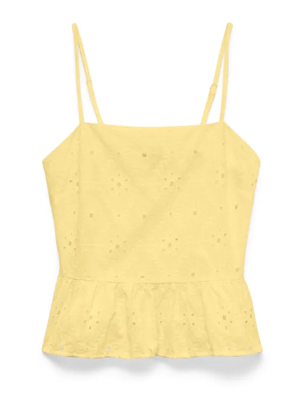 Design: Gevoerde zoom/rand, Getailleerd model; Materiaal: Katoen; Halstype: Carréhals; Motief: Effen; Soort bandjes: Spaghettibandjes; Details: Peplum, Borduursels, Mesh; Extra's: Op staal naden, Voelt zacht aan; Pasvorm: Slanke pasvorm; Armlengte: Mouwloos; Lengte: Normale lengte