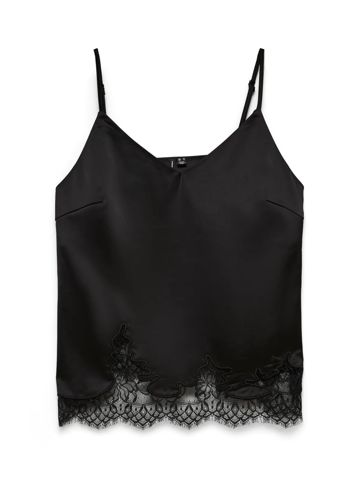 Design: Figuurnaden, Zoom/rand met boord; Materiaal: Satijn; Halstype: V-hals; Motief: Effen; Soort bandjes: Spaghettibandjes; Details: Kant; Extra's: Verstelbare bandjes, Op staal naden; Pasvorm: Normale pasvorm; Armlengte: Mouwloos; Lengte: Normale lengte