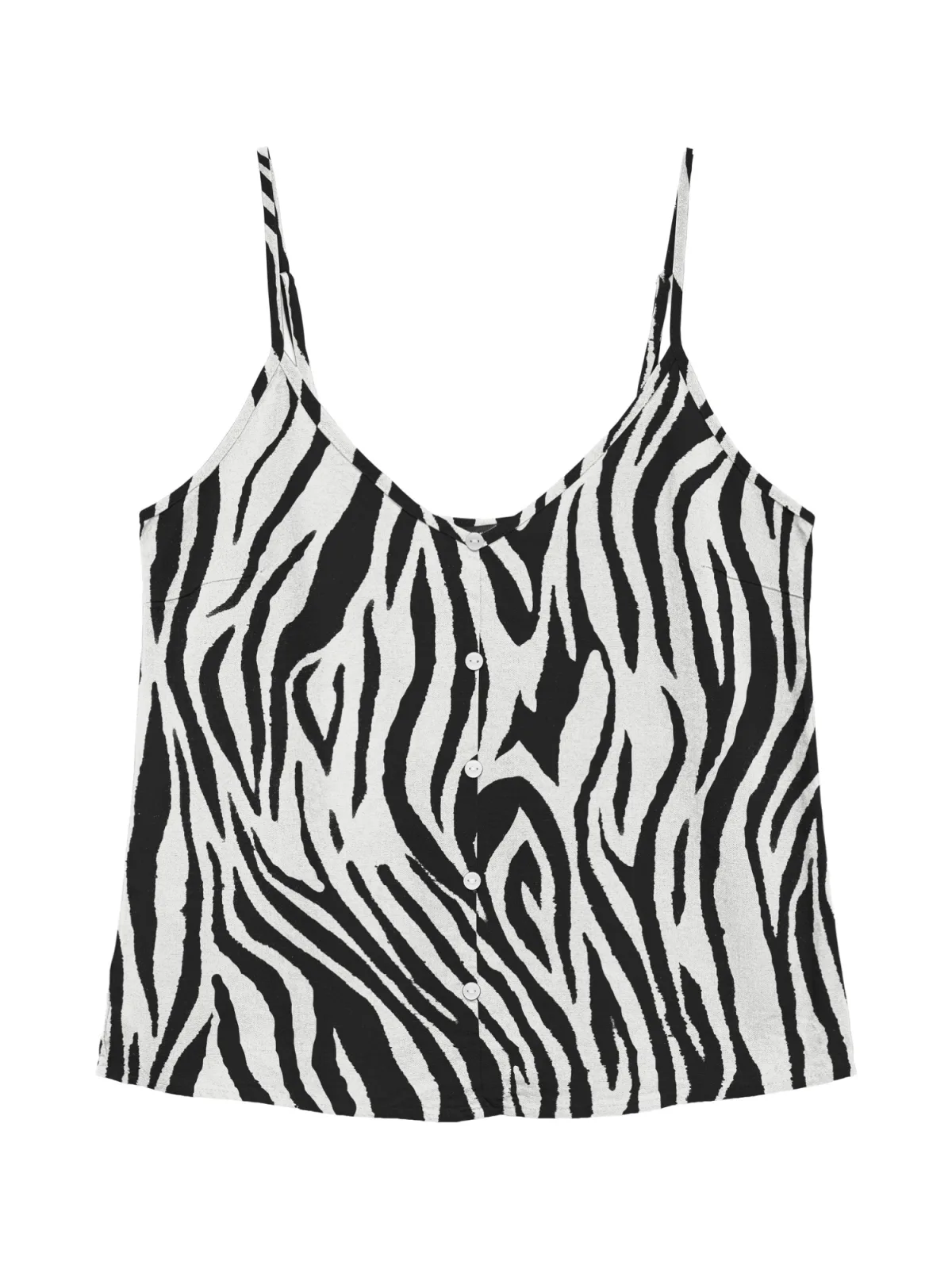 Blouse type: Blouseshirt; Design: Gevoerde zoom/rand, Rechte zoom; Materiaal: Viscose; Halstype: V-hals; Motief: Dierenprint; Kraag: Zonder kraag; Soort bandjes: Spaghettibandjes; Extra's: All-over patroon, Gladde stof; Pasvorm: Normale pasvorm; Armlengte: Mouwloos; Lengte: Normale lengte