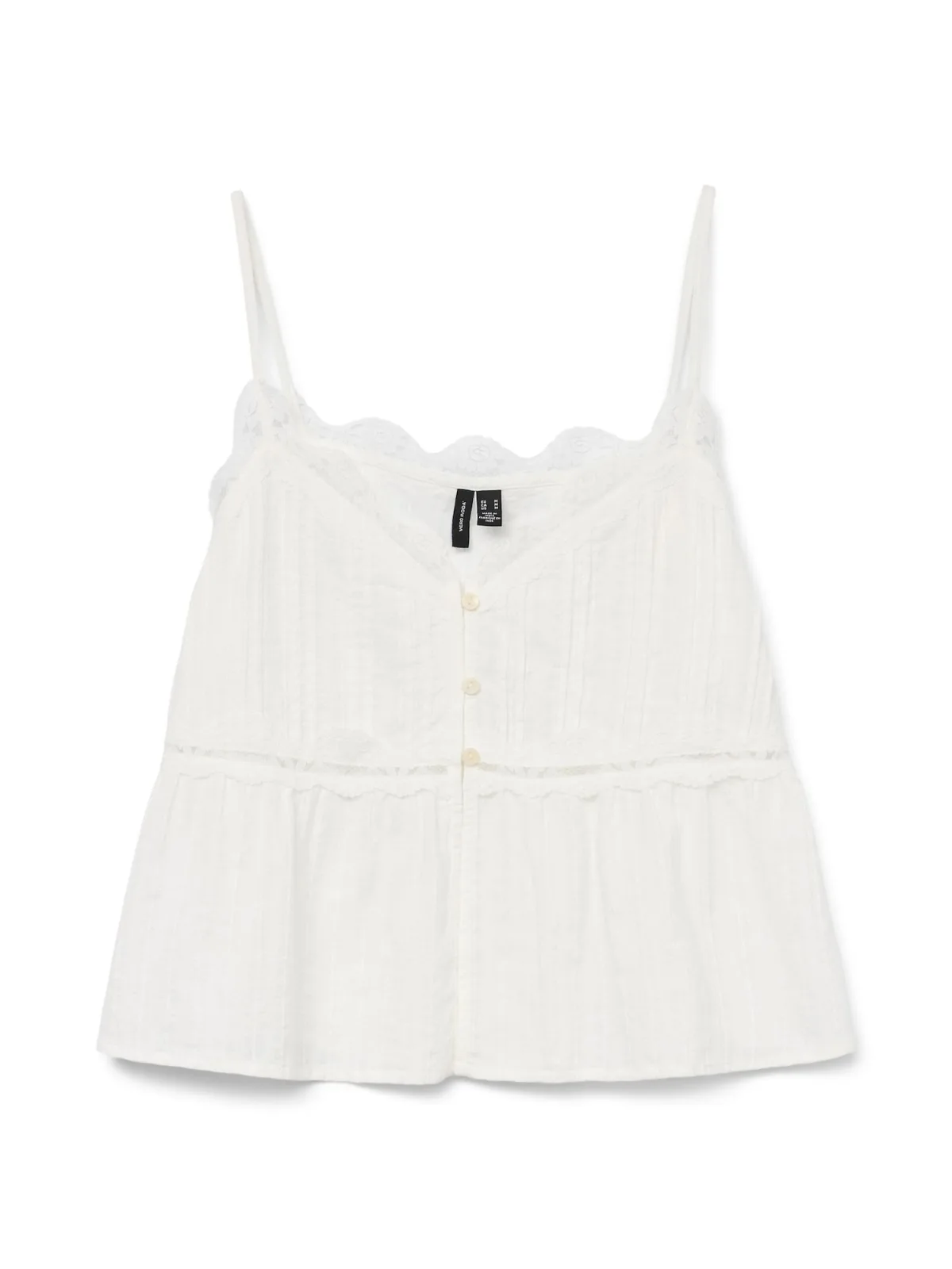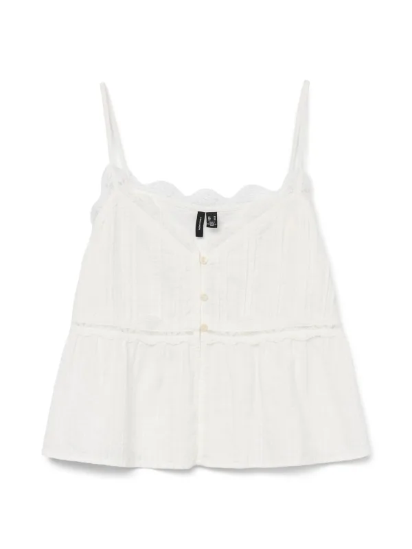 Design: Diepe snit/decolleté, Knop sluiting; Materiaal: Katoen; Halstype: V-hals; Motief: Effen; Soort bandjes: Spaghettibandjes; Details: Kant, Plooien; Extra's: Licht transparant, Op staal naden; Pasvorm: Normale pasvorm; Armlengte: Mouwloos; Lengte: Normale lengte