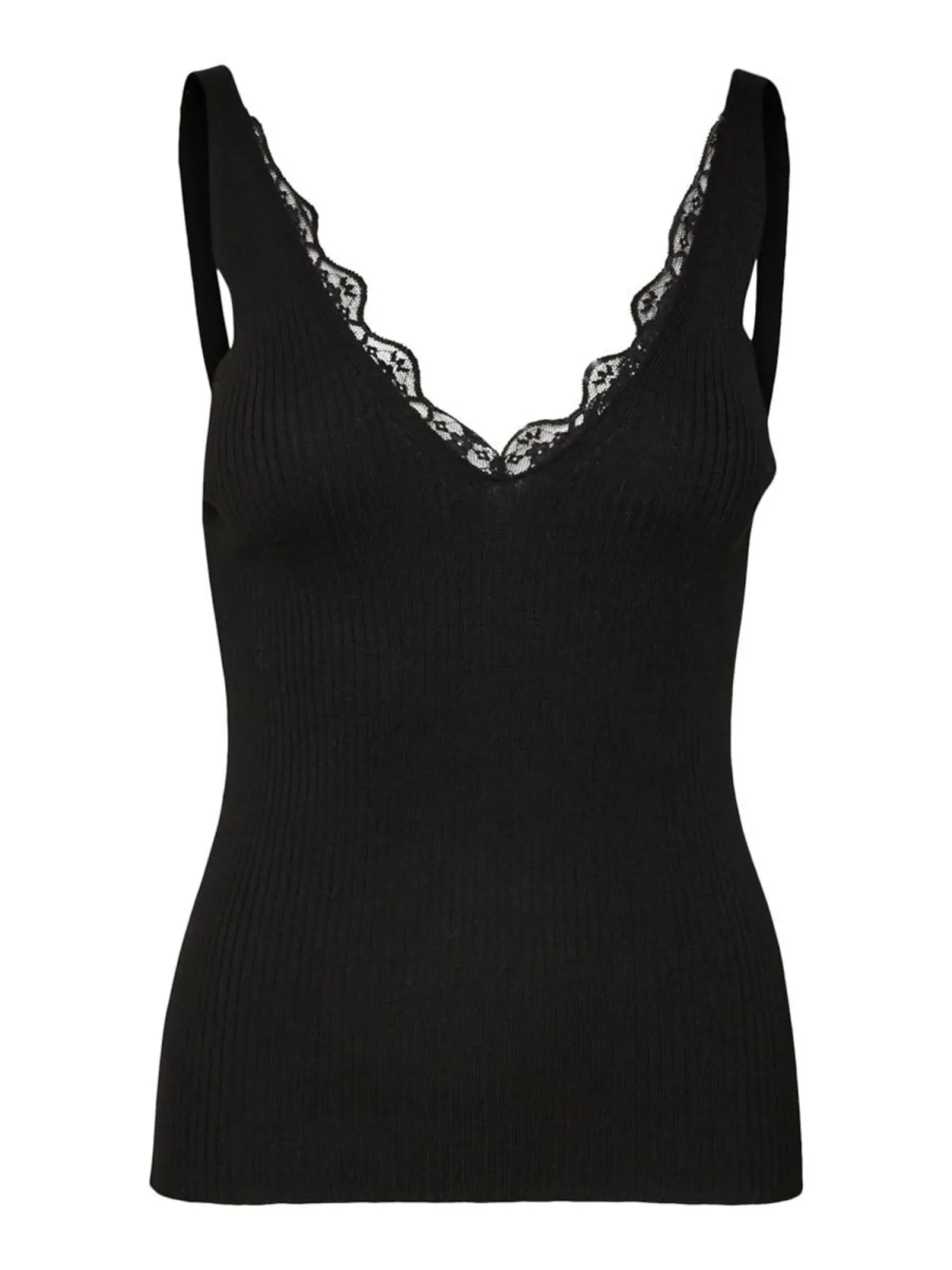 Design: Geribbeld gebreid; Materiaal: Viscose; Halstype: V-hals; Motief: Effen; Soort bandjes: Normale bandjes; Details: Kant; Pasvorm: Slanke pasvorm; Armlengte: Mouwloos; Lengte: Normale lengte