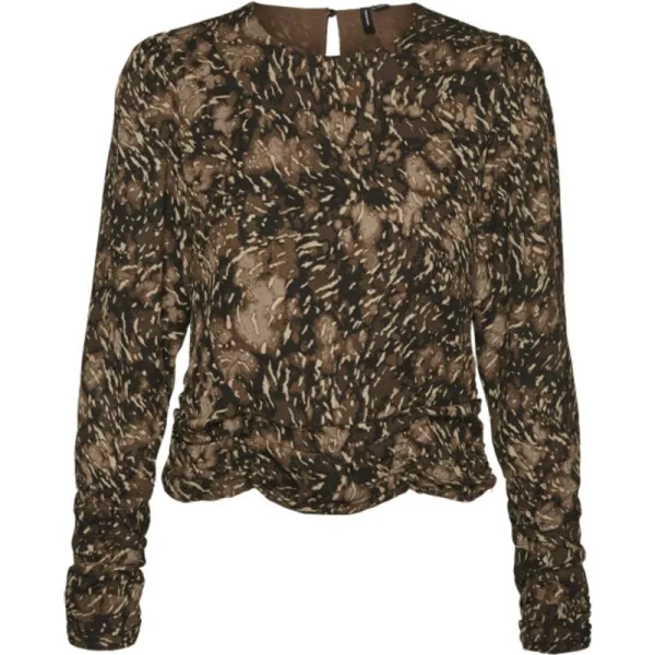 Upgrade je garderobe met deze prachtige top van Vero Moda, verkrijgbaar in een trendy bruin dessin. Perfect voor zowel alledaagse outfits als voor speciale gelegenheden. Deze top is gevoerd en uitgerust met lange mouwen en een elegante ronde hals met keyhole detail aan de achterzijde. De mouwen zijn afgewerkt met smokwerk, wat zorgt voor een speelse touch. De onderzijde van de top is voorzien van geplooide details en heeft een subtiel ritsdetail aan de linkerzijnaad. De allover print maakt deze top extra bijzonder. Gemaakt van duurzaam materiaal, namelijk 68% gerecycled polyester en 32% polyester, en de voering is 100% polyester. Bestel nu en voeg deze must-have top toe aan je collectie!