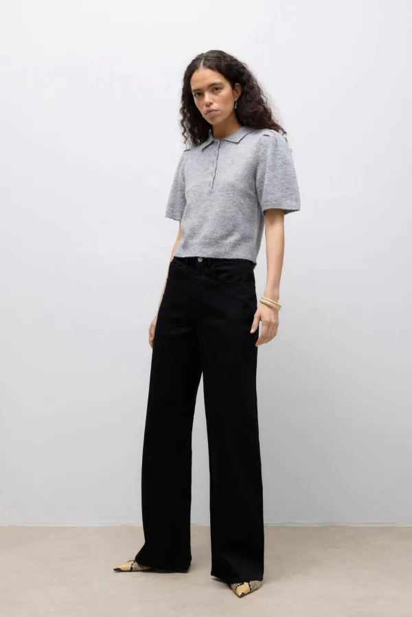 Design: Knop placket, Pofmouwen, Geribd ceintuurtje; Materiaal: Knitwear; Halstype: Polokraag; Motief: Mélange; Extra's: Fully fashioned; Pasvorm: Normale pasvorm; Armlengte: Halve mouw; Lengte: Normale lengte