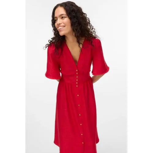 Deze MELANEY jurk van VERO MODA heeft korte mouwen en een middel lange lengte. De jurk heeft een v-hals en een knoopsluiting. Met geweven structuur en een pasvorm die volgens maatadvies normaal valt.