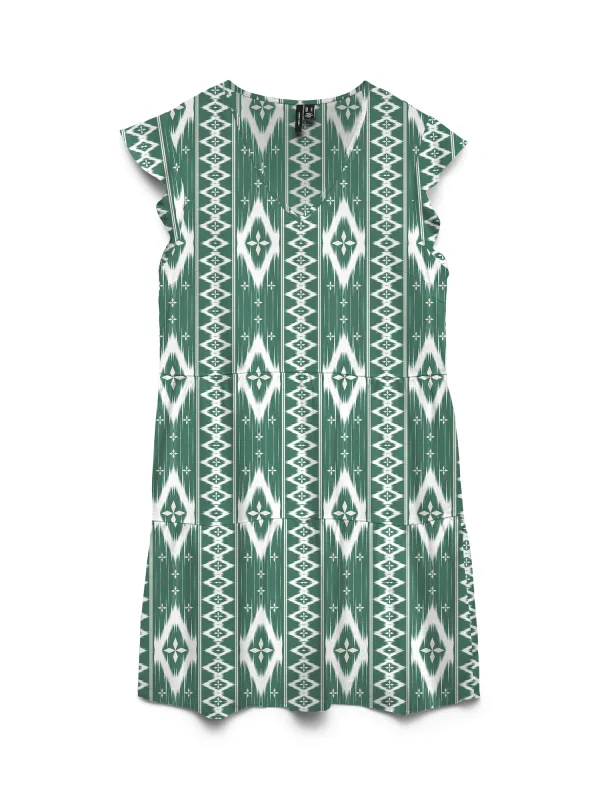 Design: Gevoerde zoom/rand, Gesneden mouw; Materiaal: Viscose; Halstype: V-hals; Details: Ruches, Volant; Extra's: All-over patroon, Gladde stof; Lengte: Kort/mini; Snit: Getailleerd; Pasvorm: Normale pasvorm; Armlengte: Kwartmouw