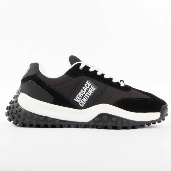 Versace Fondo Hyber herensneakers in zwart synthetisch materiaal. Originele Versace merkschoen – Versace streetwear/sportswear design – Versace herenmode, perfect voor dagelijks gebruik – Zwarte Versace sneakers die ideaal te combineren zijn met je garderobe – Comfortabel synthetisch materiaal – Klassieke veters – Fondo Hyber – Synthetisch