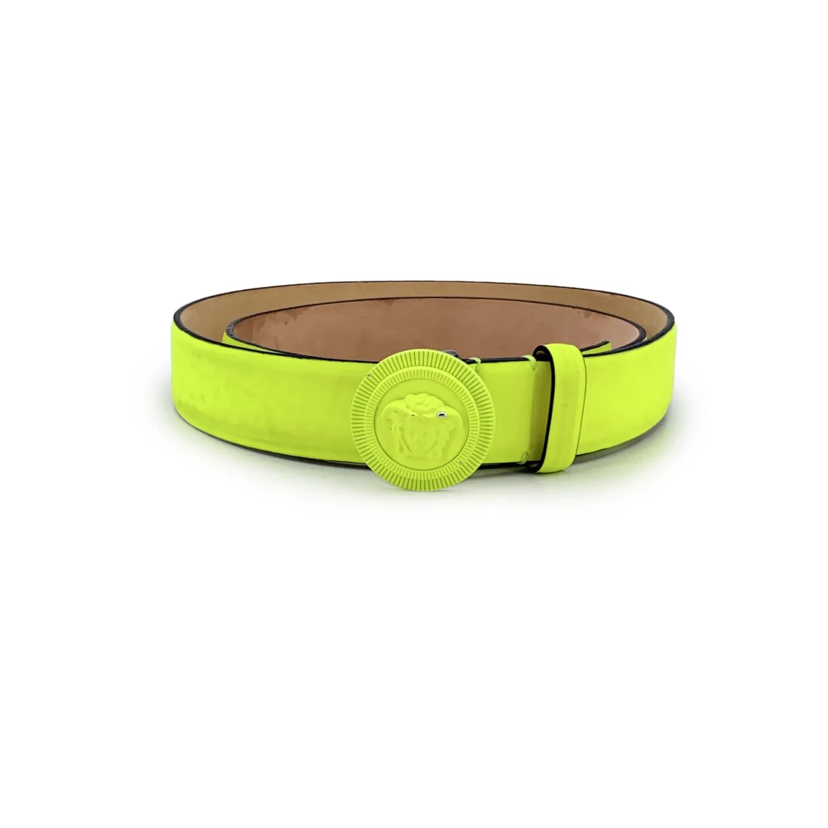 VINTAGE, RRP ALS NIEUW Dit prachtige item wordt geleverd met een certifikaat van echtheid. Het certificaat wordt zonder extra kosten verstrekt. Maak een gedurfde statement met deze Versace-riem in levendig Fluo Geel - een kleurensplash die elke look onmiskenbare energie geeft. Gemaakt van soepel, geschuurd kalfsleer, is dit opvallende accessoire de perfecte mix van high fashion en speelse rand. In het midden is de iconische Medusa-logo gesp afgewerkt met een bijpassende neongele coating, wat een opvallende, monochromatische uitstraling creëert. Een drukknoopsluiting zorgt voor een veilige pasvorm terwijl de slanke lijnen behouden blijven. Gemaakt in Italië en maat 90/36, is deze riem ideaal om een vleugje luxe toe te voegen aan je lente- en zomergarderobe - of het nu wordt gecombineerd met frisse denim, broeken of om een jurk. Een gedurfde uitdrukking van Versace's onverschrokken geest. Conditiewaardering: B - ZEER GOEDE CONDITIE Conditiedetails: Licht gebruikt. Minimale verkleuring op leer door normaal gebruik. Minimale coatingverlies op de Medusa gesp. Controleer de foto's zorgvuldig en vraag als je meer details nodig hebt of als je twijfels hebt. Doos?: Afmetingen: lengte: 900 mm riemlengte: 0 mm hengeldropping: 0 mm