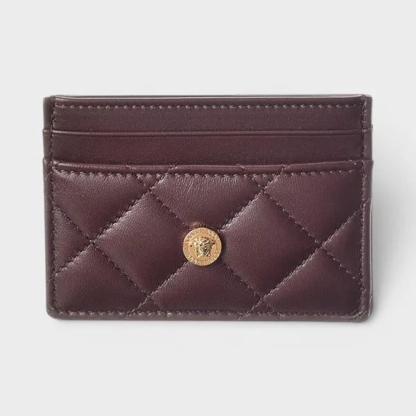 Compact en verfijnd, dit Versace gewatteerde kaarthouder in aubergine heeft een kenmerkend logo-ontwerp en een gestructureerde afwerking. Geproduceerd uit faux leer en synthetische materialen, biedt het een veilige opbergplek voor essentiële kaarten en glijdt het gemakkelijk in een zak of tas. Ideaal voor dagelijkse organisatie met een eigentijdse, luxe uitstraling.