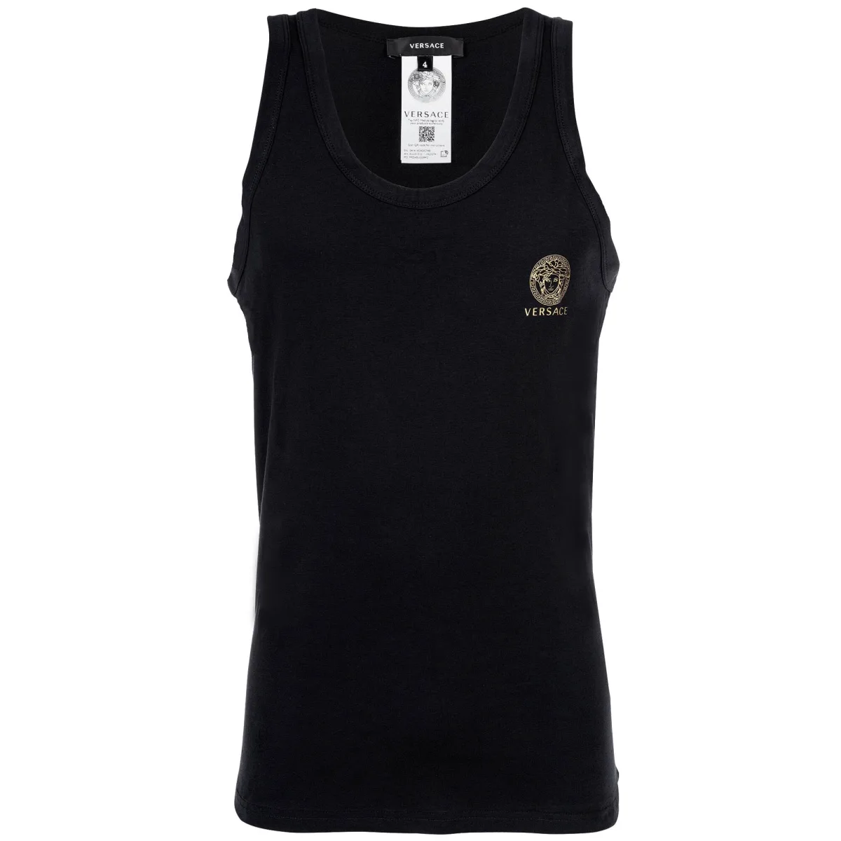 Hoge kwaliteit herenslip met ronde hals van het merk VERSACE. Elastische katoenjersey kwaliteit, met gouden VERSACE-logo/Medusa-print.