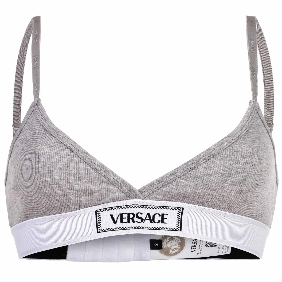 Geribbelde bralette van het merk VERSACE. Driehoekvorm met achtersluiting en verstelbare bandjes, onderbustband met logo, stretchkatoen.