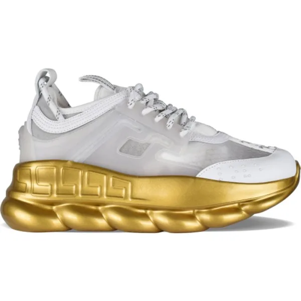 Versace Chain Reaction sneakers van wit nylon.Witte leren details.Ton-sur-ton logo op de zichtbare zijkant.Dikke gouden rubberen zool met kettingeffect.Kwal-symbool in reliëf op de achterkant.Vetersluiting.Ronde neus.Gemaakt in Italië.