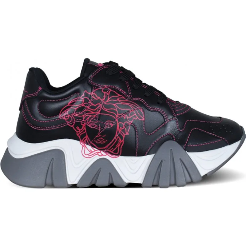 Versace Squalo sneakers van zwart leer en fuchsiakleurige stiksels.Fuchsia Medusa-motiefprint aan de buitenkant.Versace fuchsia-letters op de tong.Witte en grijze rubberen zool.Gemaakt in Italië.