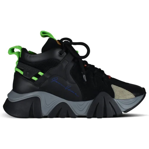 Versace Squalo sneakers in zwart leer.Grijze en zwarte dikke rubberen zool.Versace inscriptie op de tong.Zwarte en grijze suède inzetstukken.Handtekening Gianni Versace.Fluorescerende groene details.Vetersluiting.Ronde neus.100% leer.Gemaakt in Italië.