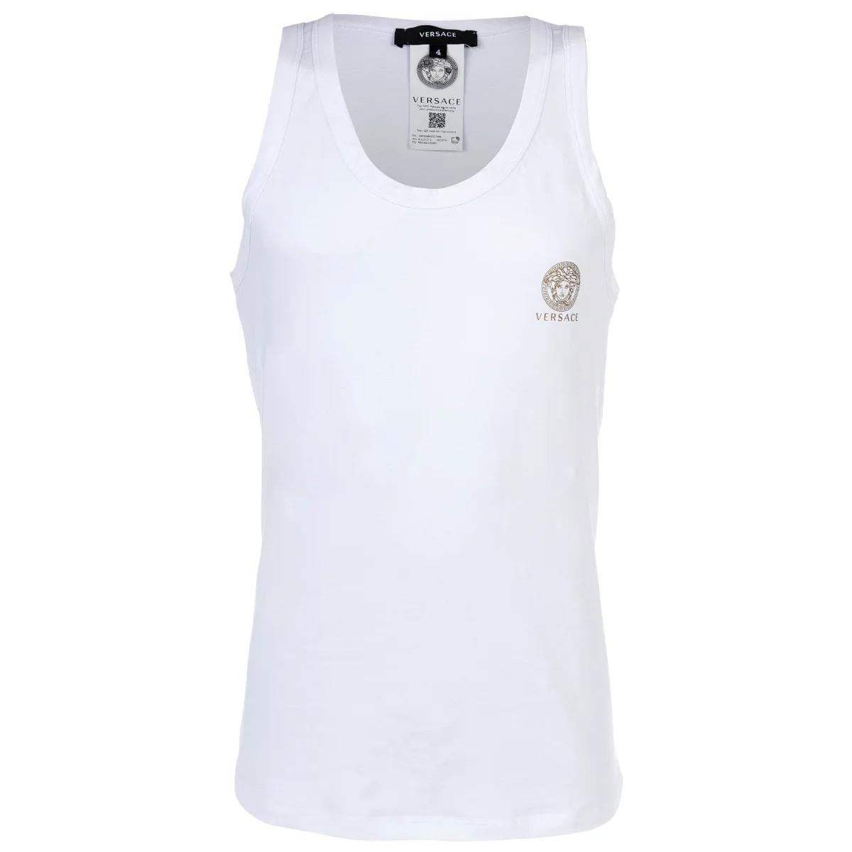 Hoge kwaliteit heren onderhemd met ronde hals van het merk VERSACE. Elastische katoenen jerseykwaliteit, met gouden VERSACE logo/Medusa-print.