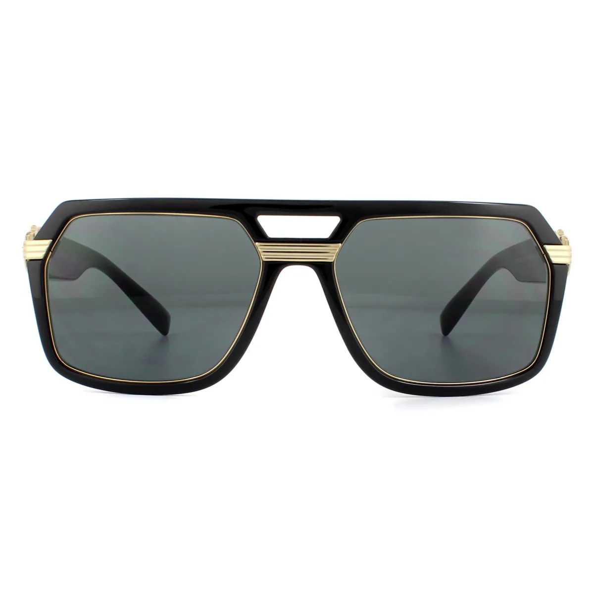 Versace Zonnebril VE4399 GB1/87 Zwart Donkergrijs is een opvallende hoekige pilootstijl geïnspireerd op de jaren '80, met gelaserde gepolijste metalen accenten en rijke Greca Medusa medaillons met emaille aan de kop van de steunen.