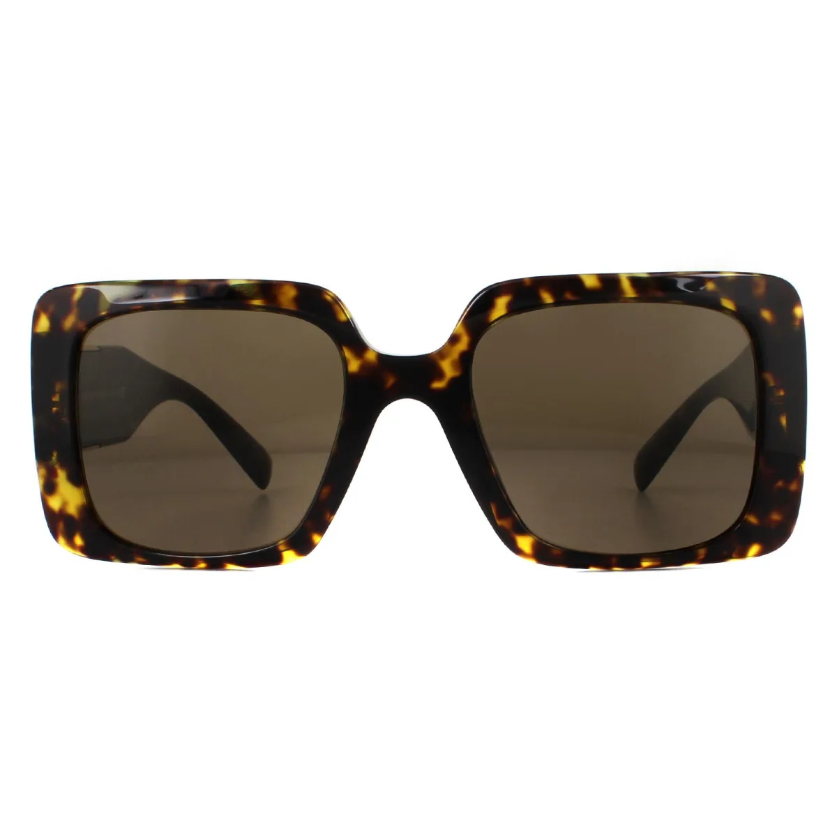 Versace zonnebrillen VE4405 108/73 Havana Dark Brown zijn een oversized acetaatontwerp met schuine schuine profielen en brede tempels verfraaid met de nieuwe uitgesneden metalen plaque met 3D Medusa in het midden.