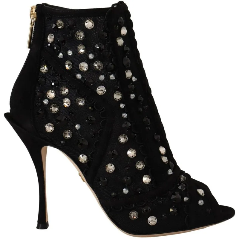 Stap naar buiten, straal helder en trek de aandacht. Deze Dolce & Gabbana enkellaarsjes brengen ongeëvenaarde Italiaanse luxe naar je garderobe. Het weelderig versierde ontwerp vangt het licht, zodat je met elke stap straalt. Gemaakt van een mix van suede en delicate mesh, bieden deze peep-toe laarsjes duurzame, onderhoudsvriendelijke draagcomfort. De ritssluiting zorgt voor een veilige, verstelbare pasvorm. De stiletto hak geeft een glamoureuze lift. Perfect voor avondevenementen of om een vleugje glans aan je dagelijkse stijl toe te voegen. Deze laarsjes zijn een ware statement van elegantie en verfijning.