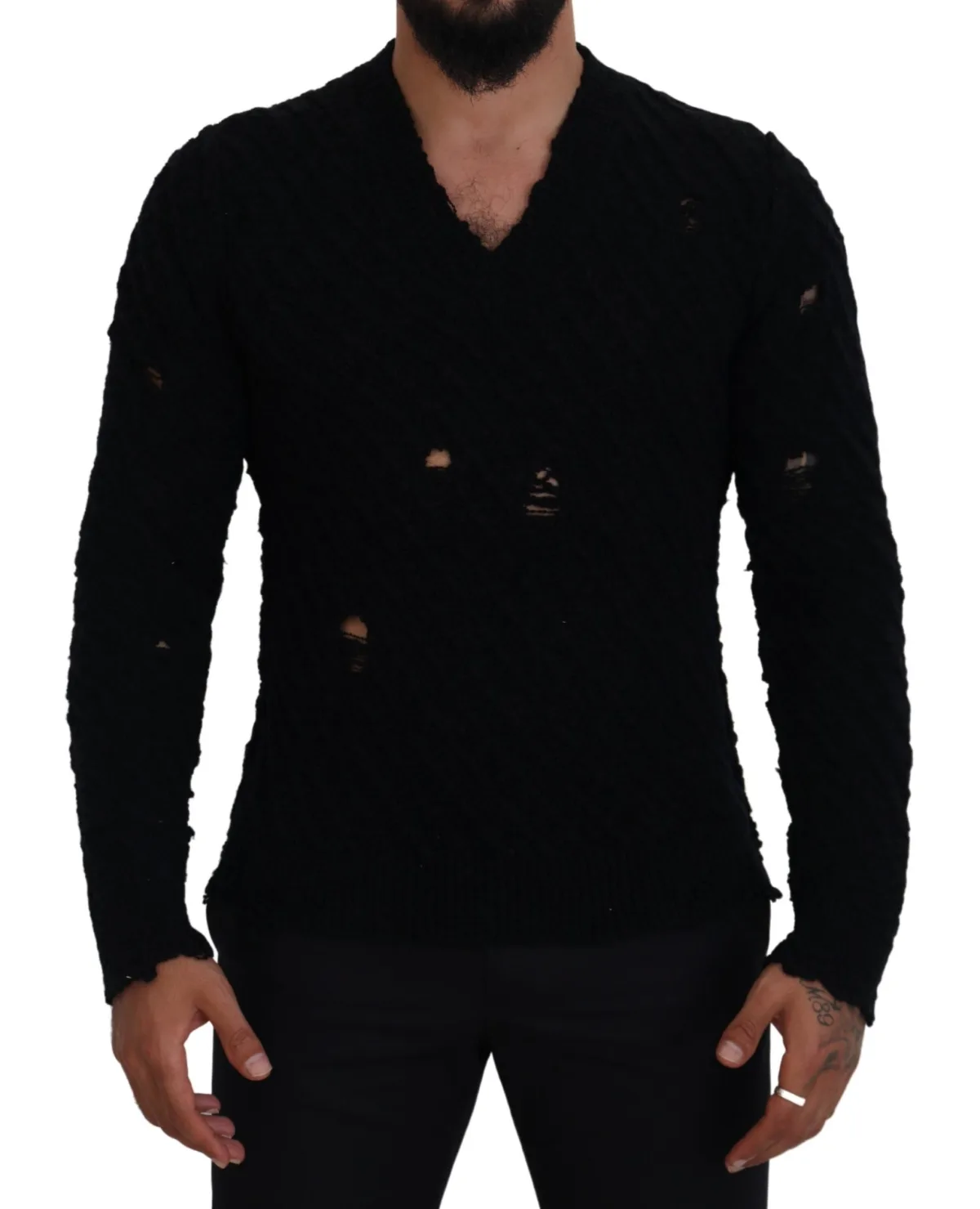 Verhoog je stijl, omarm de edge en herdefinieer comfort. Deze Dolce & Gabbana V-hals trui biedt een luxe gevoel door de constructie van zuivere wol. Het opzettelijk versleten ontwerp voegt een unieke, high-fashion cool toe aan je dagelijkse look. Ervaar de zachte omhelzing van premium materialen op je huid. De gestructureerde kabelbrei biedt warmte en visuele interesse. Handwas verzorging zorgt voor blijvende kwaliteit. Perfect om een vleugje rebelse verfijning aan je casual garderobe toe te voegen, is deze trui een statement stuk.
