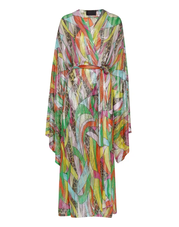 Laat je verleiden door deze Diva-look: we hebben hem ontworpen om jouw zomer kleur te geven. Bekijk hoe je de nieuwe versie van een wikkelcaftan draagt. Multicolor gebreide lurex viscose jersey met patchprint Bandjes voor Wijde kimono-mouwen Tweenaaldsstiksels