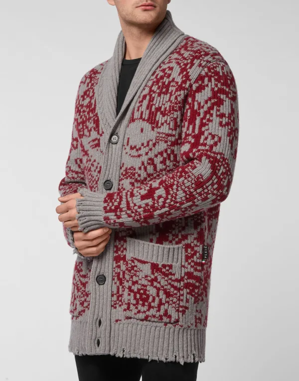 Ook een effen vest kan stijl en onderscheidend vermogen uitstralen. Kijk maar eens naar deze merinos wollen maxivariant met een all-over jacquard geweven dessin. De sjaalkraag en de twee opgestikte zakken dragen bij aan de retro-vibe die wordt gemoderniseerd door de slijtage aan de ribgebreide zomen.