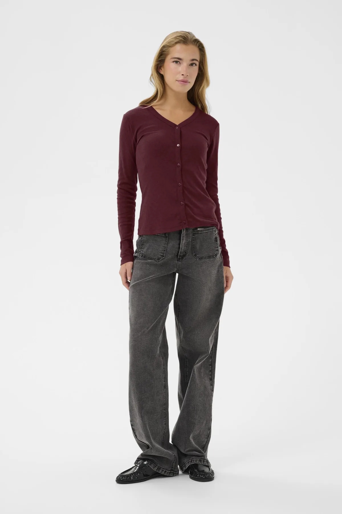Cardigan met slim fit en subtiele structuur, V-hals, lange mouwen en een knoopsluiting voor. Rechte zoom en eigentijds, strak silhouet.
