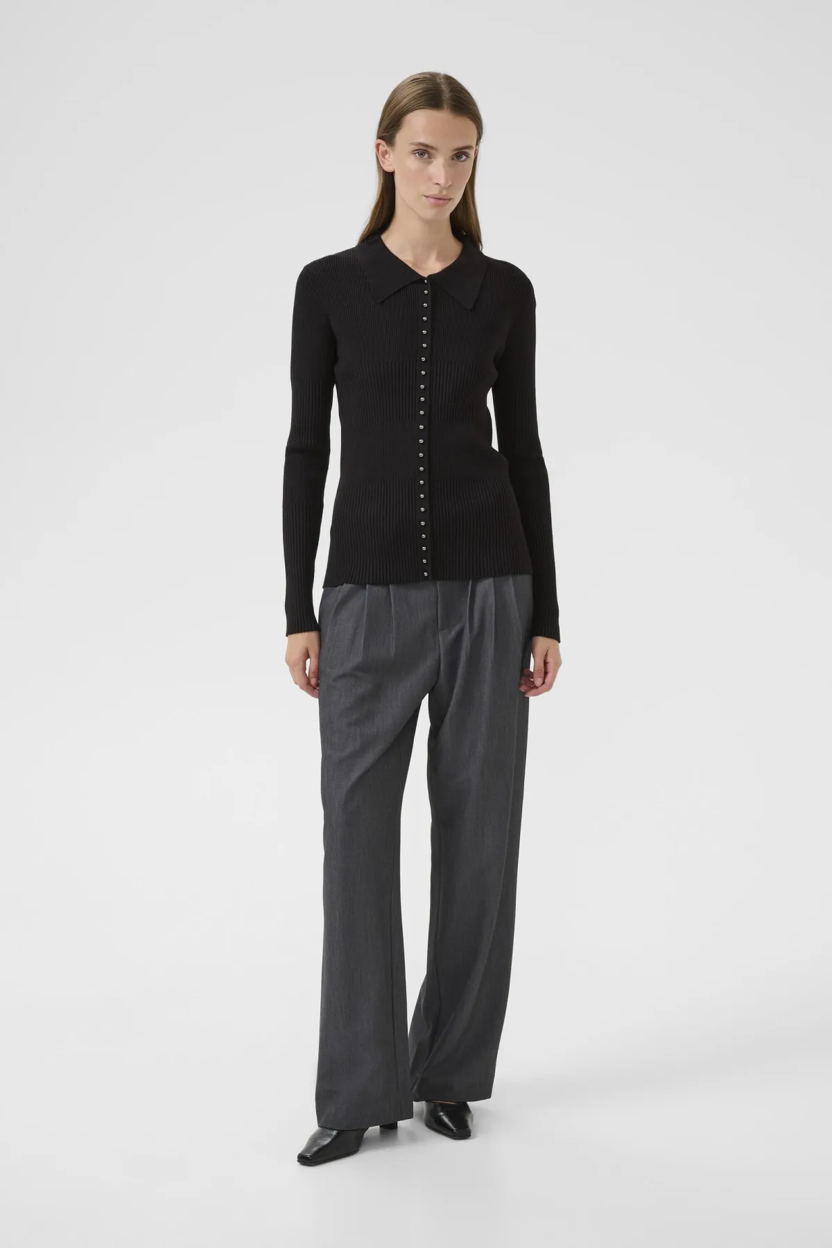 Gebreid vest met slanke pasvorm, klassieke kraag en lange mouwen. Voorzien van doorlopende knopenrij – comfortabel en geschikt voor elke gelegenheid.