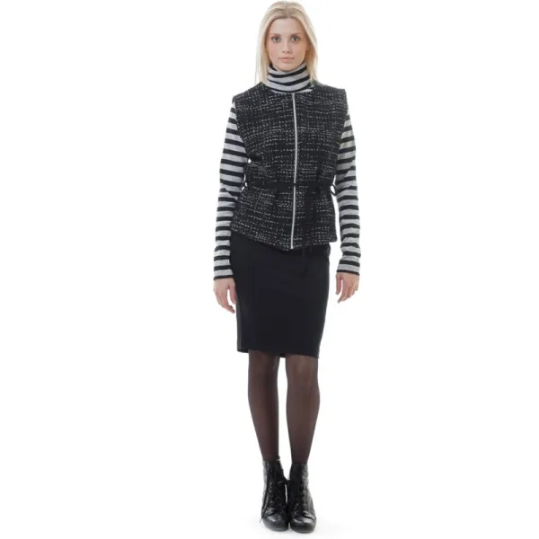 Verhoog de stijlfactor met dit ultra-chique vest van 2-Young. Gemaakt van contrasterende stoffen, is de voorkant aangenaam gestructureerd in een warm tweekleurig breisel, terwijl de stretchstof achterkant zorgt voor een onmiskenbaar perfecte pasvorm. Een bandje omsluit de taille voor een vrouwelijk gevoel. Het getoonde model is 170cm en draagt maat 36/S.