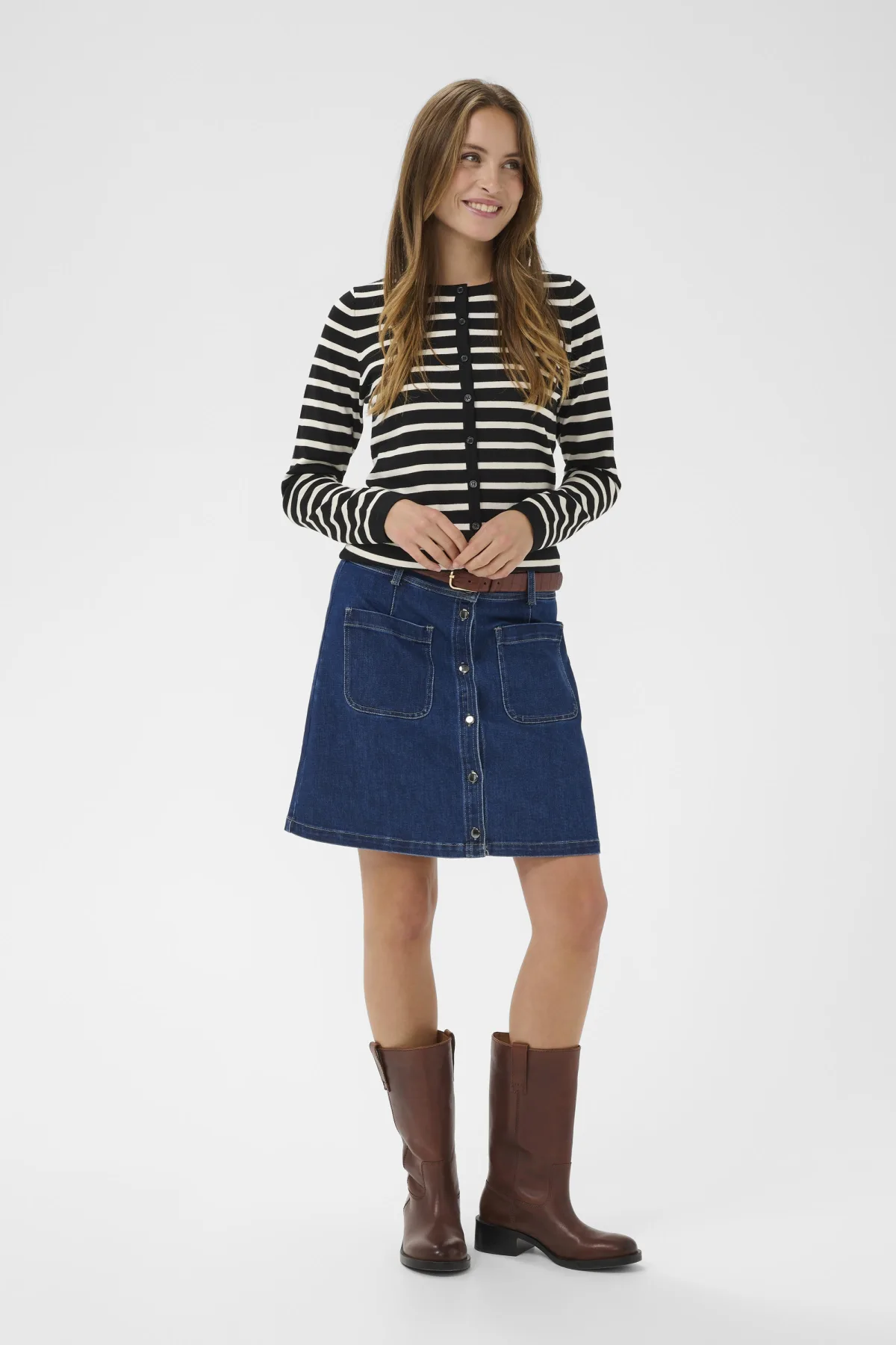 Dit gestreepte vest heeft een klassieke ronde halslijn en een knoopsluiting aan de voorkant. De zachte gebreide stof en het tijdloze patroon maken het een ideale laag voor elk seizoen.