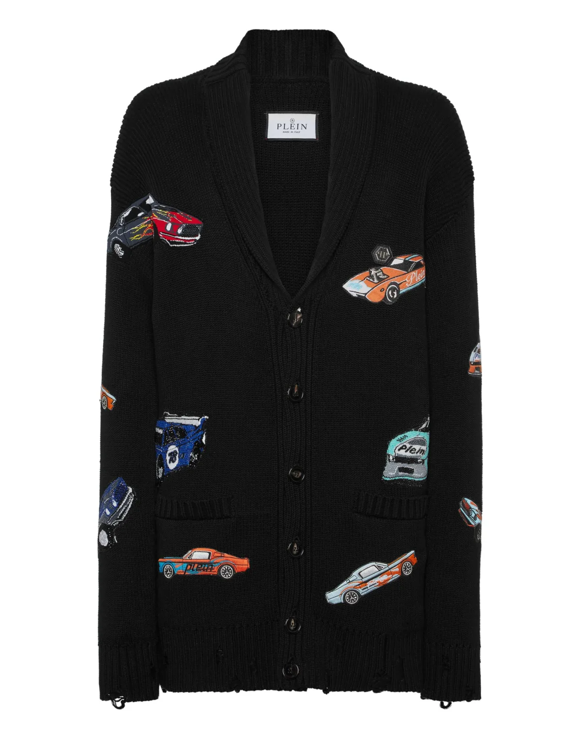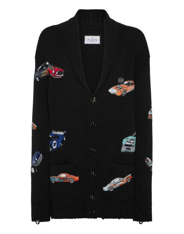 Innovation and creativity are the roots of the style of Plein. Discover the features of this cotton knit cardigan. 5-gauge knit cotton Embroidered patches sewn all over Shawl collar Logoed patch Buttons fastening Two patch pockets Rib knit, raw cut hems