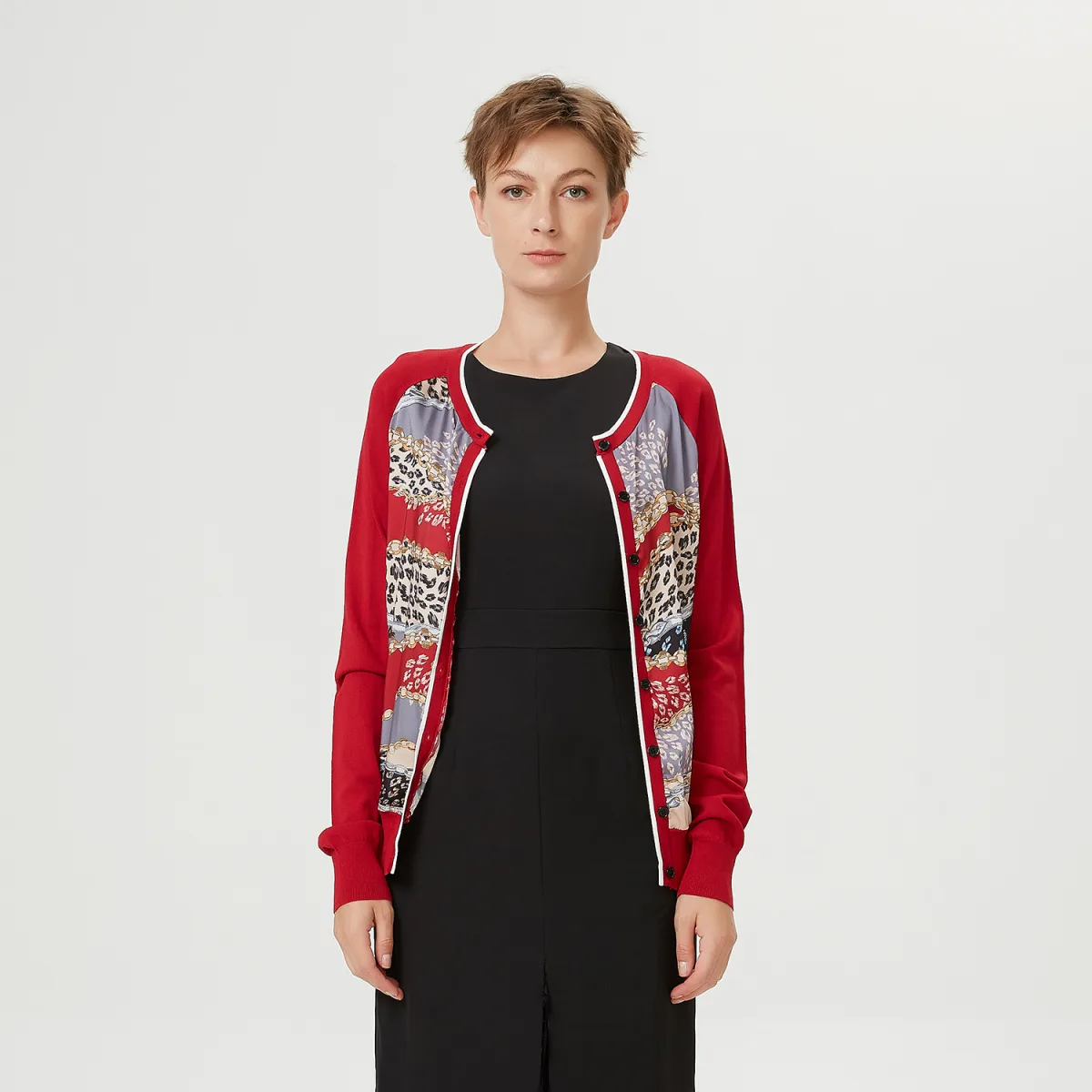Een grafisch stuk voor het middenseizoen, dit vest kenmerkt van een stretch gebreide op mouwen en achterkant en een bedrukte stof aan de voorkant. Zowel casual als elegant, om zonder moderatie te dragen. Productdetails: • vorm: recht • Lengte: 59 cm • Ronde halslijn • Lange mouwen • Midden voorgeknoopt