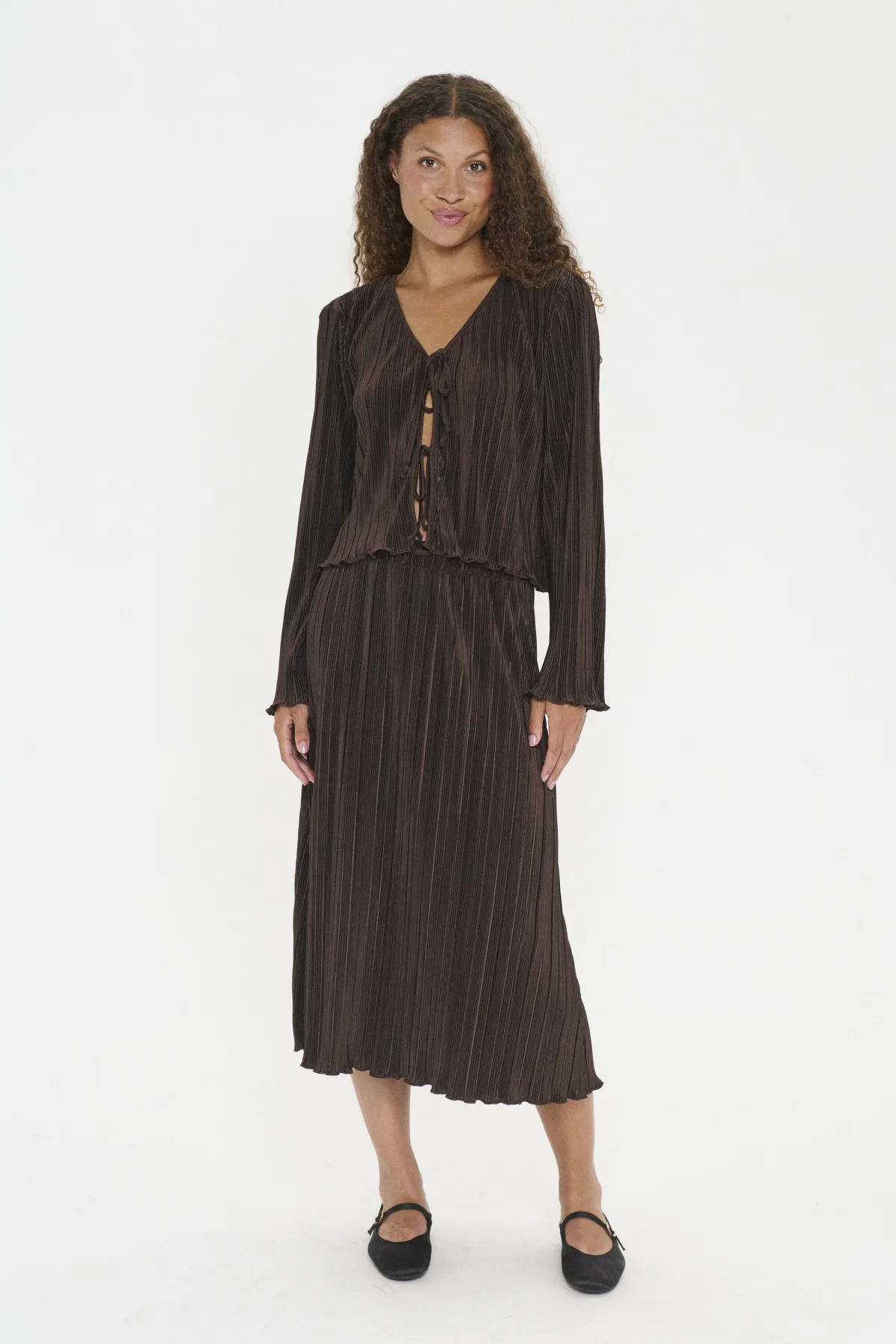 Deze blouse heeft een rechte, licht losvallende pasvorm met lange mouwen en een geplisseerde structuur. Diepe V-hals met twee striksluitingen en golvende boorden.