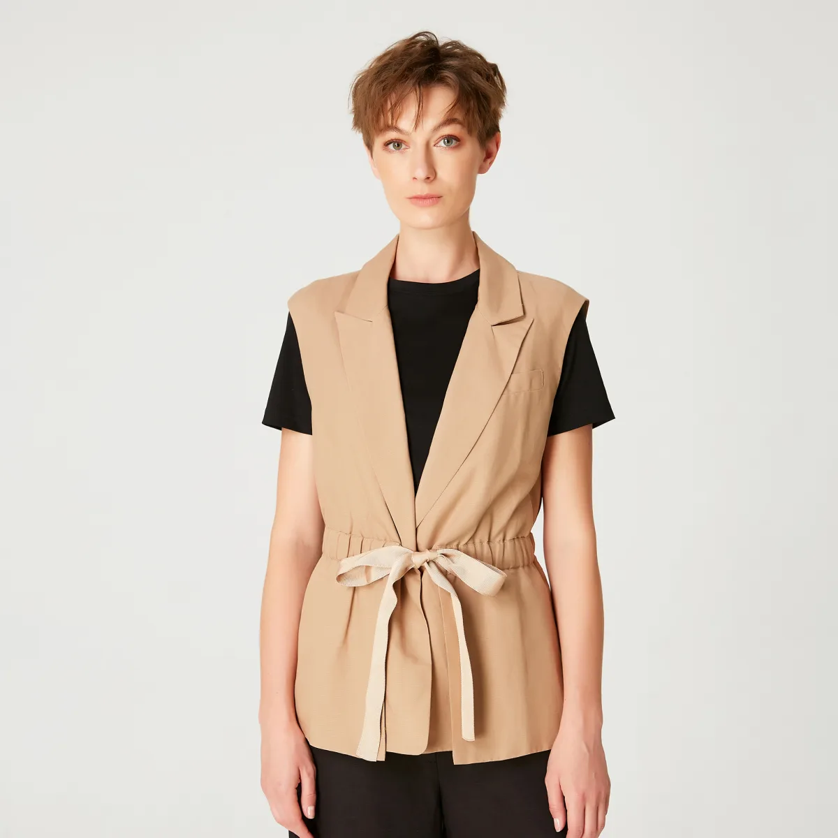 Kraag op maat, eenvoudige knop, trekkoordriem met een lint om te binden of los te laten. Een tijdloos en veelzijdig stuk dat een chique maar moeiteloze uitstraling brengt. Het combineert goed met een eenvoudig T-shirt en jeans voor een informele stijl of met onze "brede capri-broek" die beschikbaar zijn in dezelfde stoffen om de "totale look" te spelen. Productdetails • Vorm: op maat gemaakt, gemonteerd op de taille • Mouwloos • Geklassing • Knop midden voor en lintriem • Lengte: 67 cm