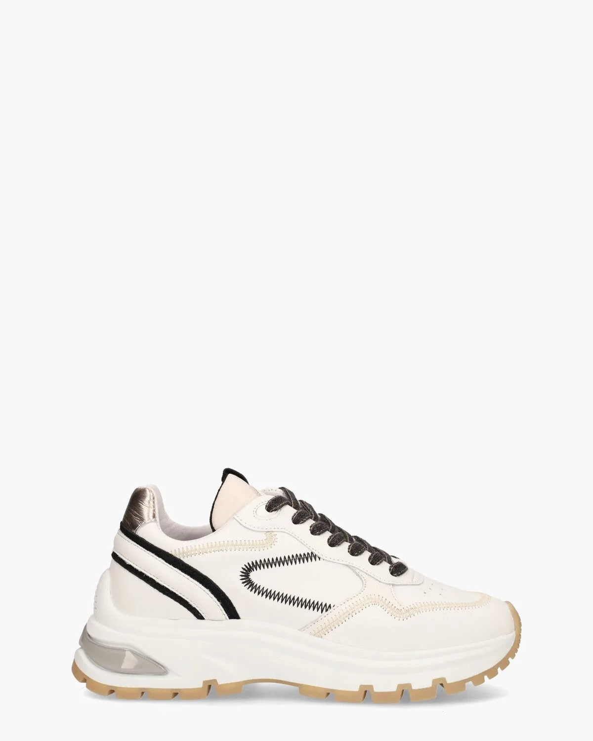 Sneakers voor dames Liz Dulce 62031-01-900 uit de collectie van VIA VAI. Dit sportieve modelletje op een chunky zool heeft een upper van leer in wit en beige afgewerkt met een metallic gouden hielcap en zwarte accenten. De binnenzijde is in stof en suède uitgevoerd en heeft een uitneembaar voetbed. Op de tong is een rond lederen VIA VAI-logo