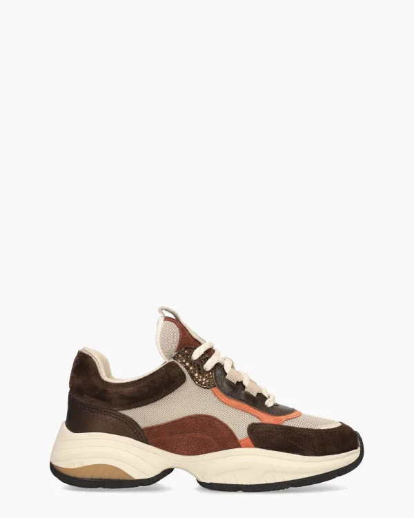 Pepper Finn 62004-01-324 bulky sneakers voor dames uit de collectie van VIA VAI. Deze runner heeft een upper van mesh, suède en leer met een printje in beige en verschillende bruintinten afgewerkt met oranje accenten. De binnenkant is van stof met een suède contrefort gemaakt en is voorzien van een uitneembaar voetbed. Het VIA VIA-logo is