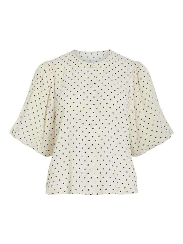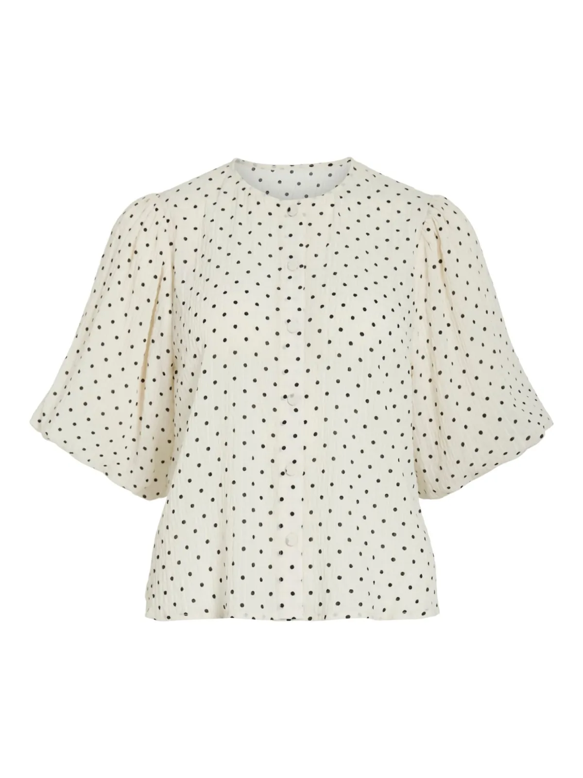 Blouse type: Klassieke blouse; Design: Knop placket, Pofmouwen, Brede mouwopeningen; Type sluiting: Knoopsluiting; Motief: Gestippeld; Kraag: Zonder kraag; Details: Gedrapeerd; Extra’s: All-over patroon, Voelt zacht aan; Pasvorm: Losse pasvorm; Armlengte: Halve mouw; Lengte: Normale lengte