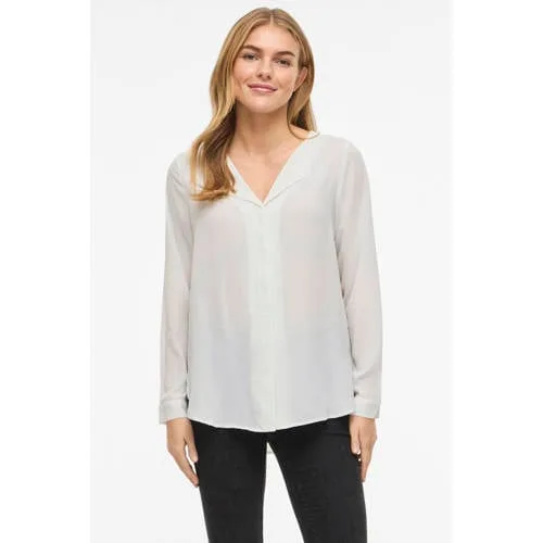 Dames blouse van het merk VILA, gemaakt van een soepel geweven polyester kwaliteit. Het model heeft een V-hals, lange mouwen met een split en knoop en sluit met een blinde knoopsluiting. De blouse valt iets wijder en is licht transparant.