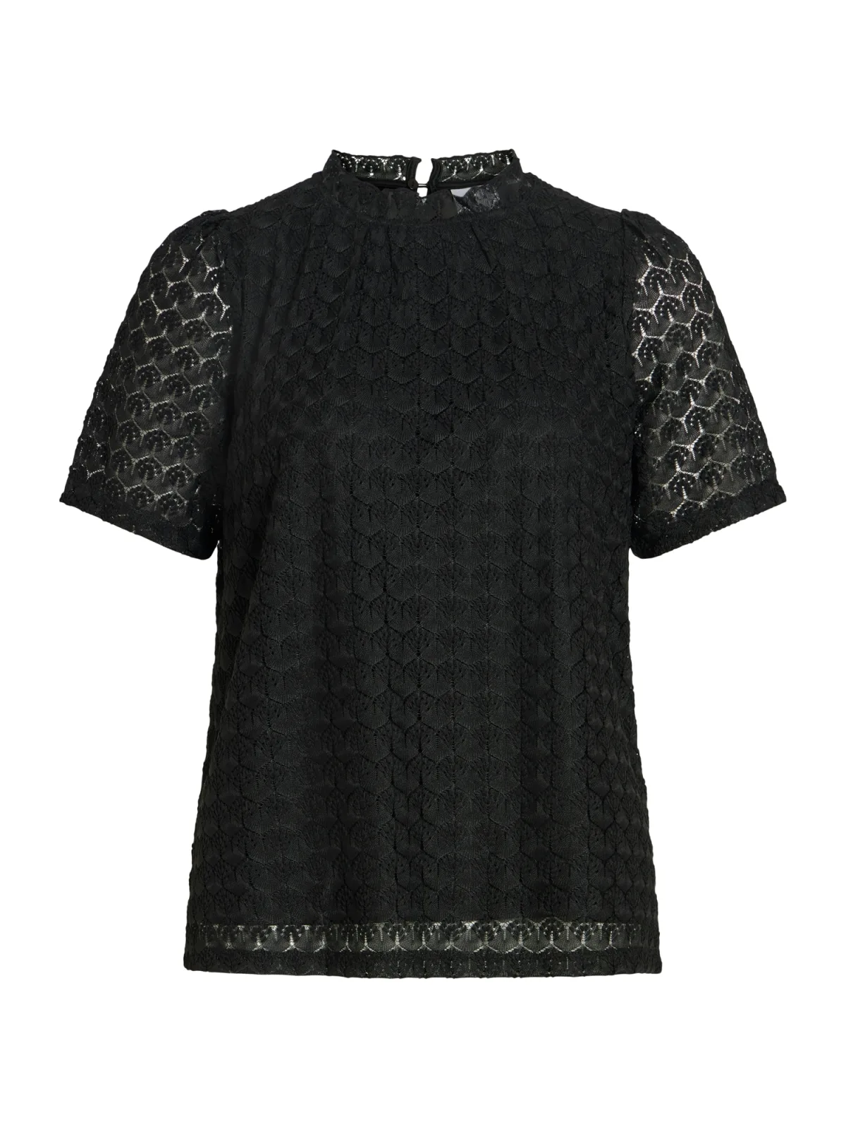 Blouse type: Blouseshirt; Design: Gevoerde zoom/rand, Keyholesluiting; Type sluiting: Knoopsluiting; Motief: Effen; Kraag: Opstaande kraag; Details: Cut-outs, Ruches, Gedrapeerd, Mesh; Extra's: Licht transparant, Op staal naden, Met textuur; Pasvorm: Normale pasvorm; Armlengte: Kwartmouw; Lengte: Normale lengte